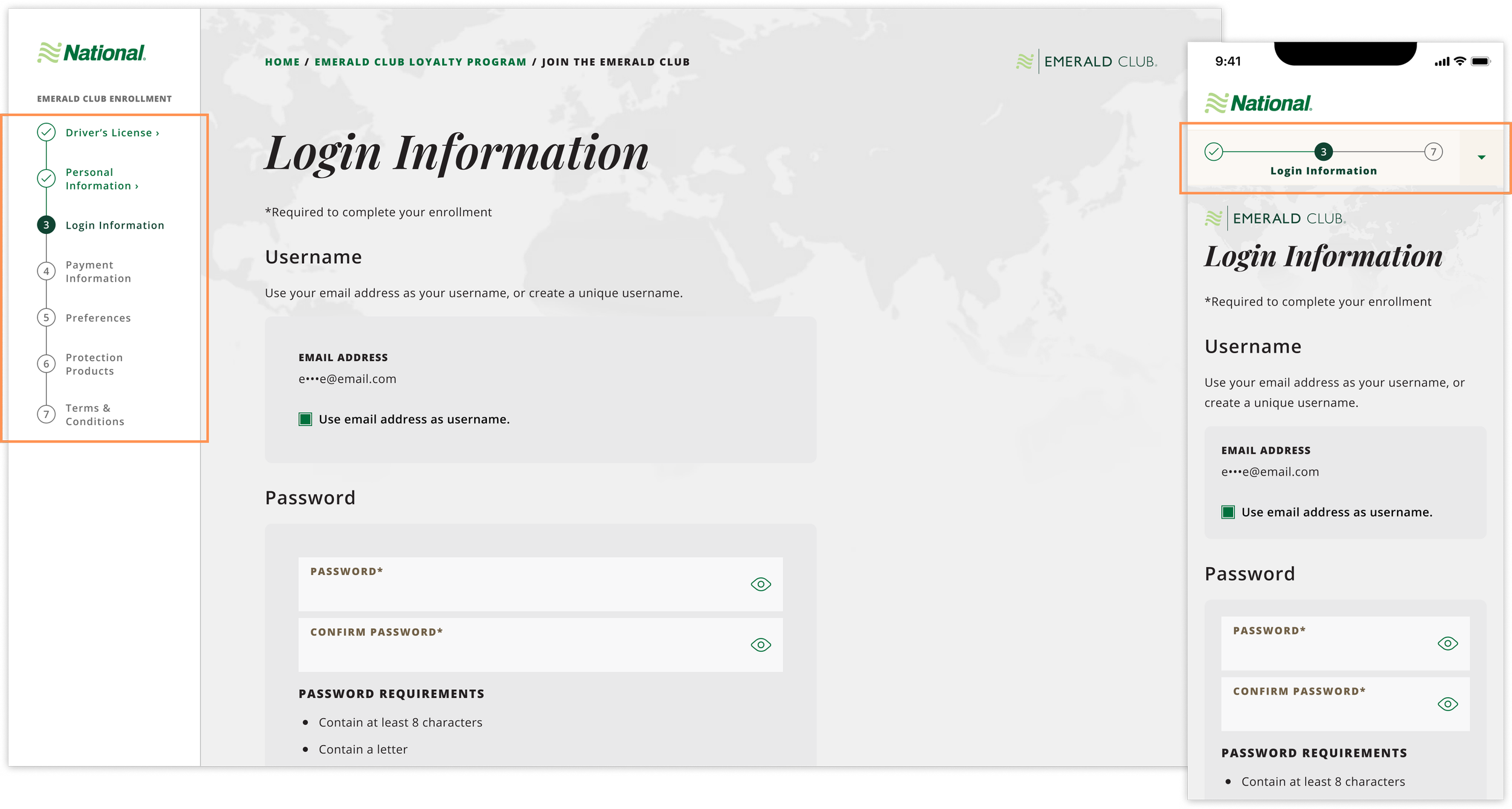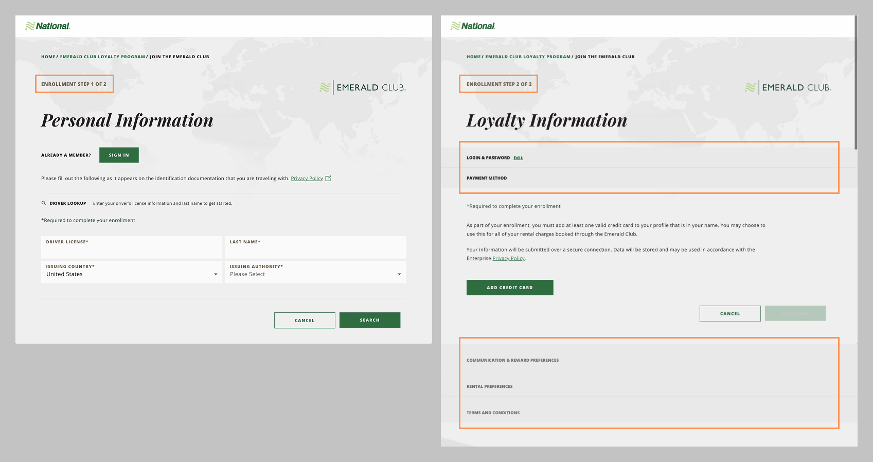 As the lead product designer, I reimagined and modernized the account creation experience for Nationalcar.com. Since signed-in users make up a majority of the car rental bookings at National Car Rental, our goal was to improve the enrollment experience by removing friction and decreasing errors.