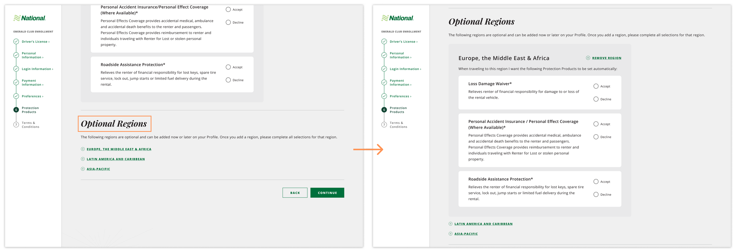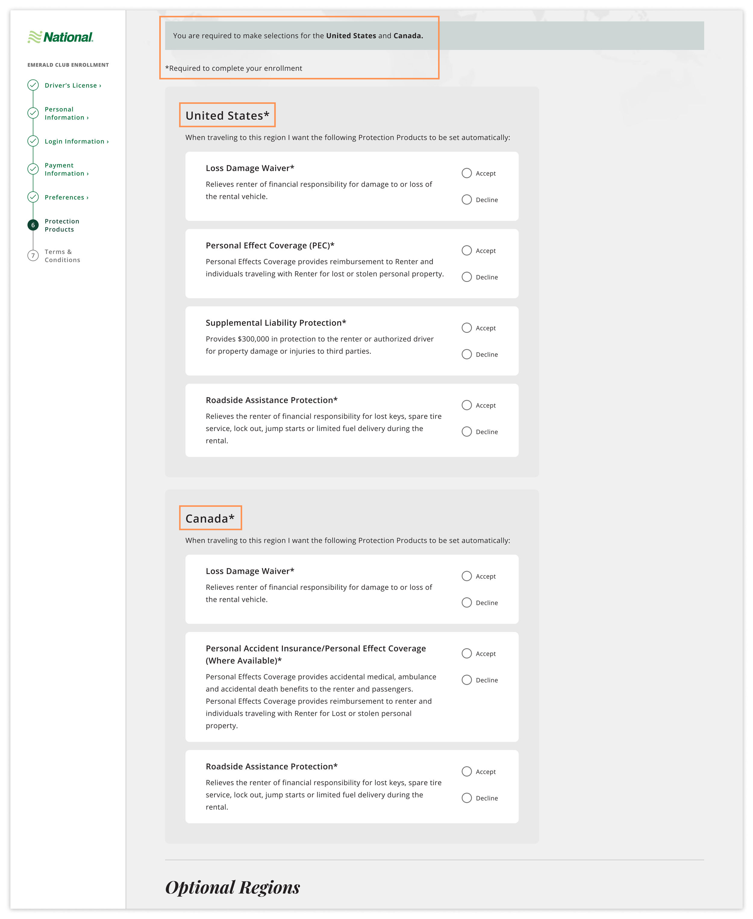 Required selections are prominently displayed and cannot be collapsed. The required regions are also clearly communicated with a banner at the top of the page and asterisks.