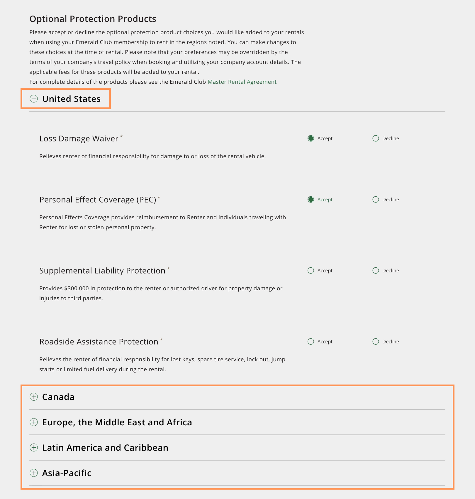 The Canada section, which is required, is closed by default, with no distinction from the optional regions.